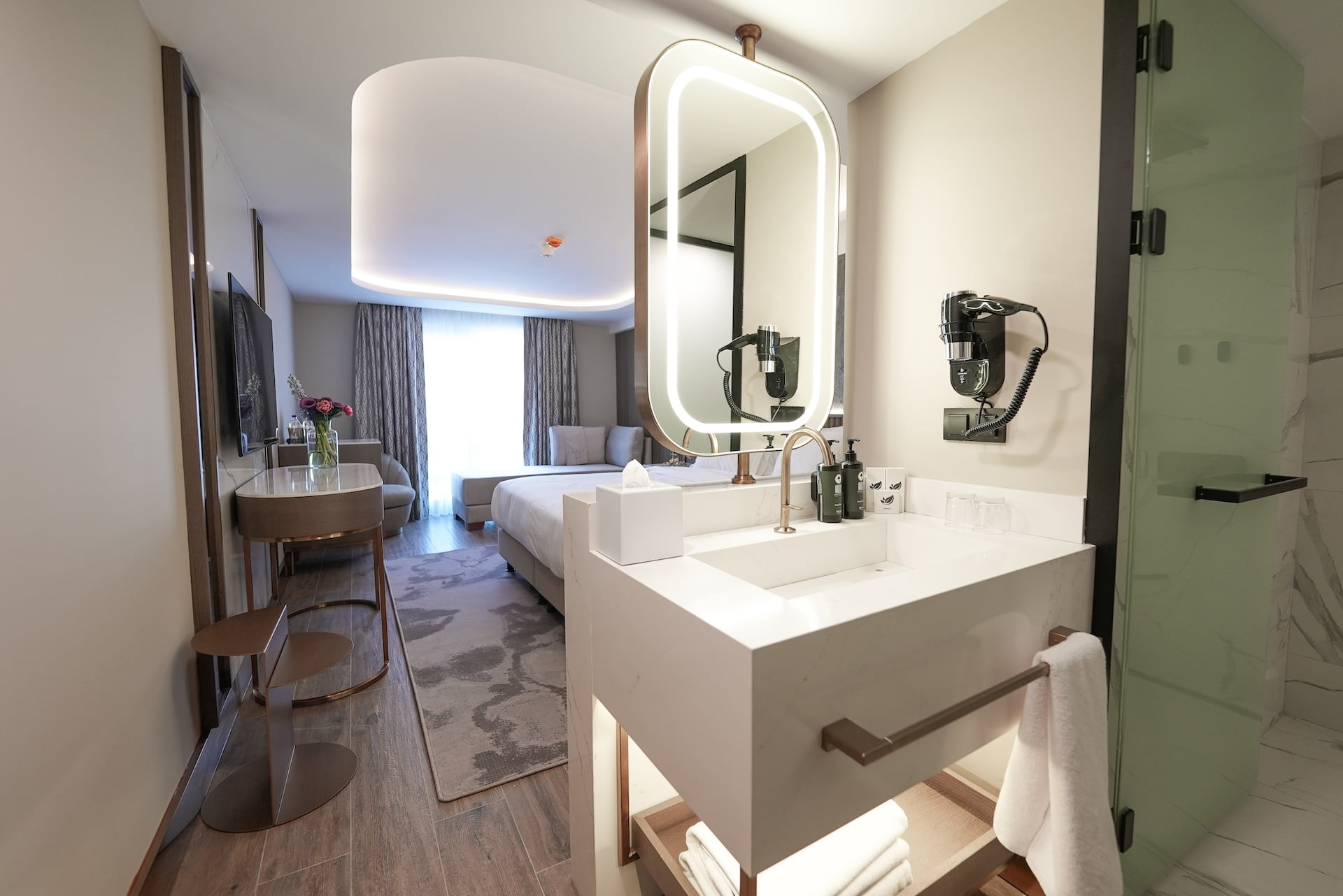 Otelimizin odalarına ait modern banyolar, geniş duş alanları veya lüks küvet seçenekleri ile konforlu bir banyo deneyimi sunar. Lüks banyo malzemeleri ve yumuşak havlu takımları, konuklarımızın kendilerini özel hissetmelerini sağlar.