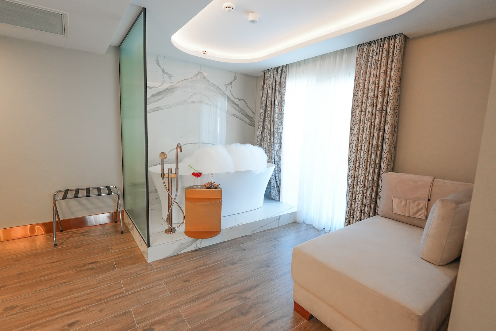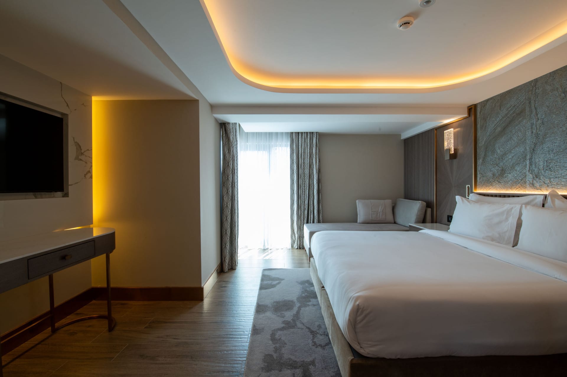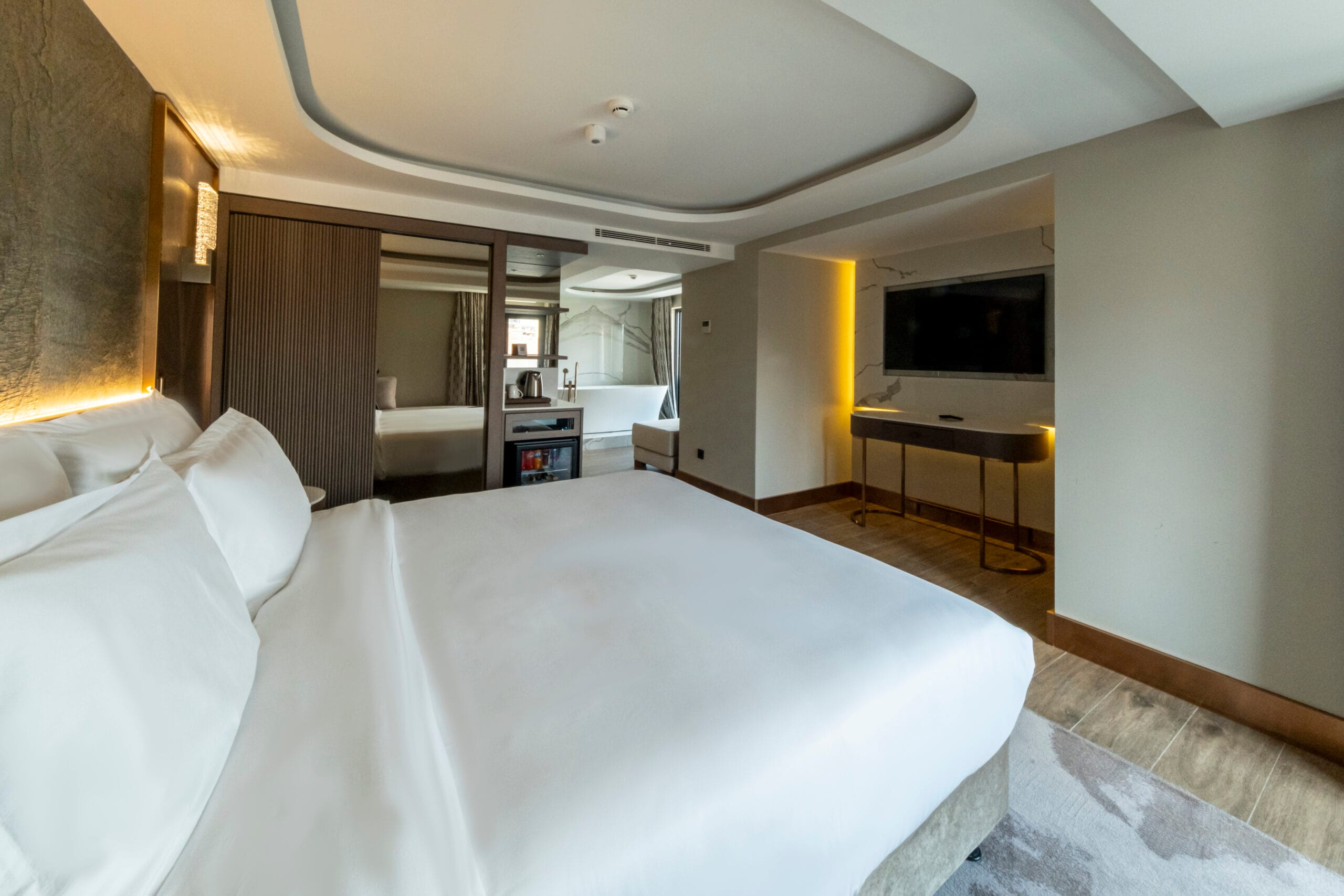 1 Geniş yatak, çekyat, kahve/çay makinesi ve dizüstü bilgisayar boyutunda kasa içeren, sigara içilmeyen Executive Süitimizde konfor ve rahatlık bir araya geliyor. Peluş nevresimler, ücretsiz yüksek hızlı Wi-Fi ve 50 inc.Ultra HD Smart TV ile ideal bir konaklama için ihtiyacınız olan her şeyi sunuyor. Ücretsiz banyo ürünleri, bornoz, duş kabini/Jakuzi, saç kurutma makinesi, ışıklı makyaj aynası, terlikler gibi ekstralar da rahatlamanıza yardımcı olur. Tercih edildiği takdirde ütü ve ütü masası, seccade olanakları sunulabilir.