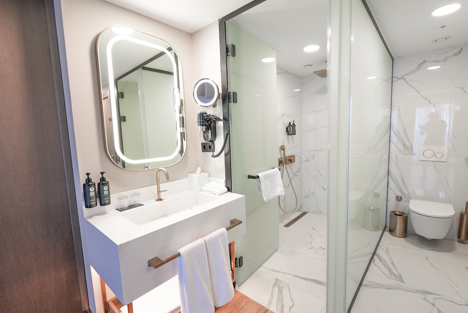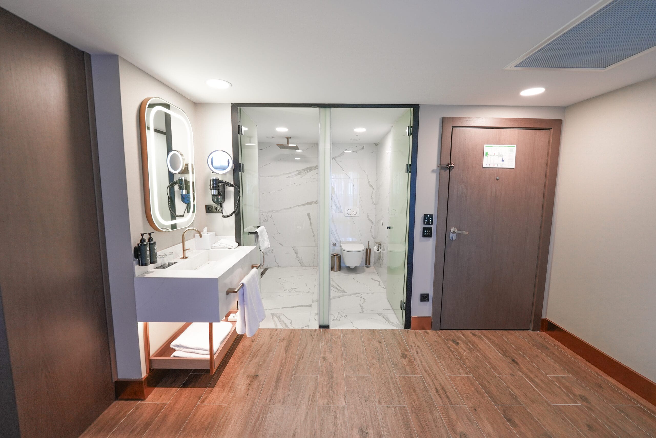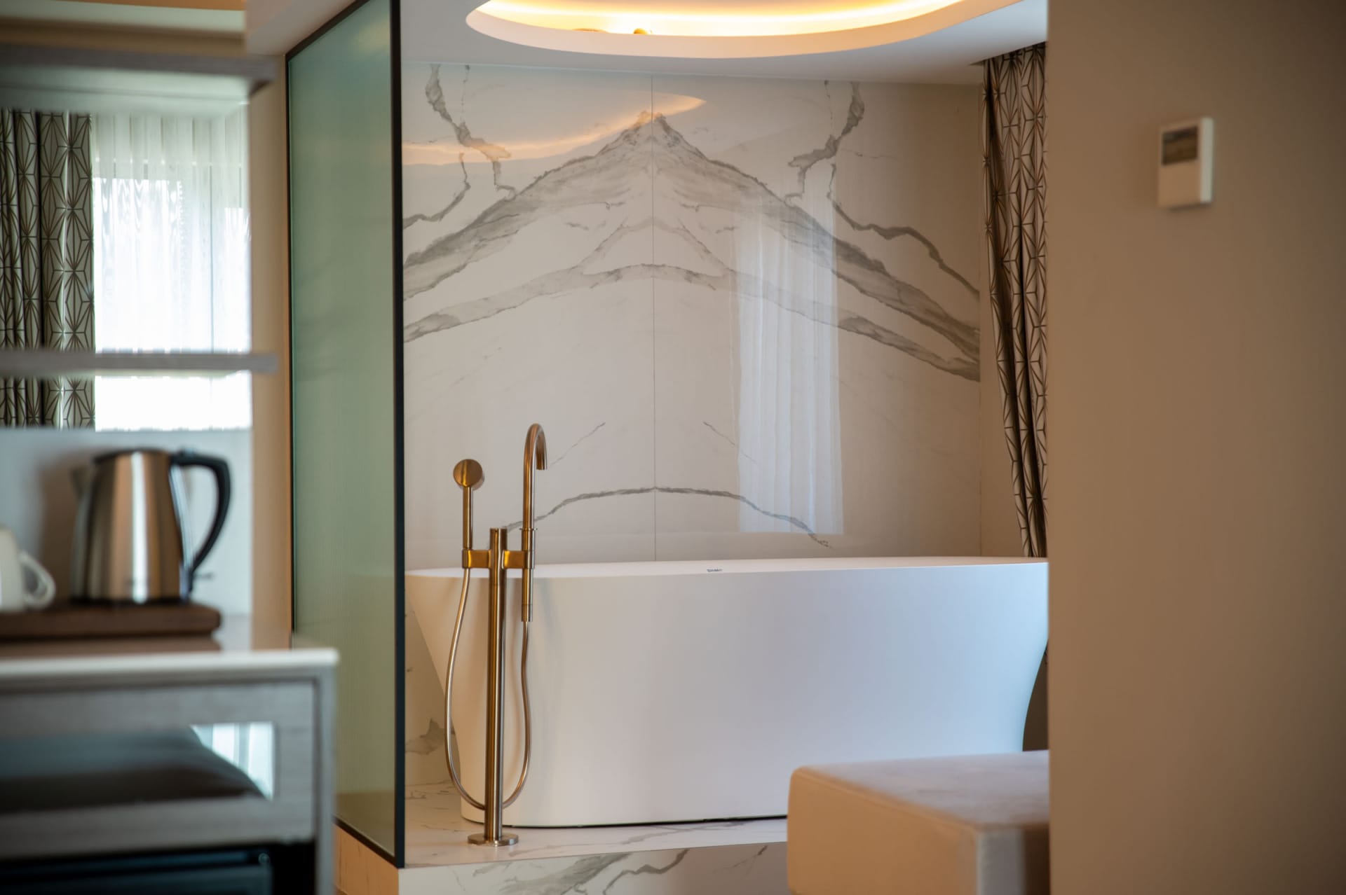 1 Geniş yatak, çekyat, kahve/çay makinesi ve dizüstü bilgisayar boyutunda kasa içeren, sigara içilmeyen Executive Süitimizde konfor ve rahatlık bir araya geliyor. Peluş nevresimler, ücretsiz yüksek hızlı Wi-Fi ve 50 inc.Ultra HD Smart TV ile ideal bir konaklama için ihtiyacınız olan her şeyi sunuyor. Ücretsiz banyo ürünleri, bornoz, duş kabini/Jakuzi, saç kurutma makinesi, ışıklı makyaj aynası, terlikler gibi ekstralar da rahatlamanıza yardımcı olur. Tercih edildiği takdirde ütü ve ütü masası, seccade olanakları sunulabilir.