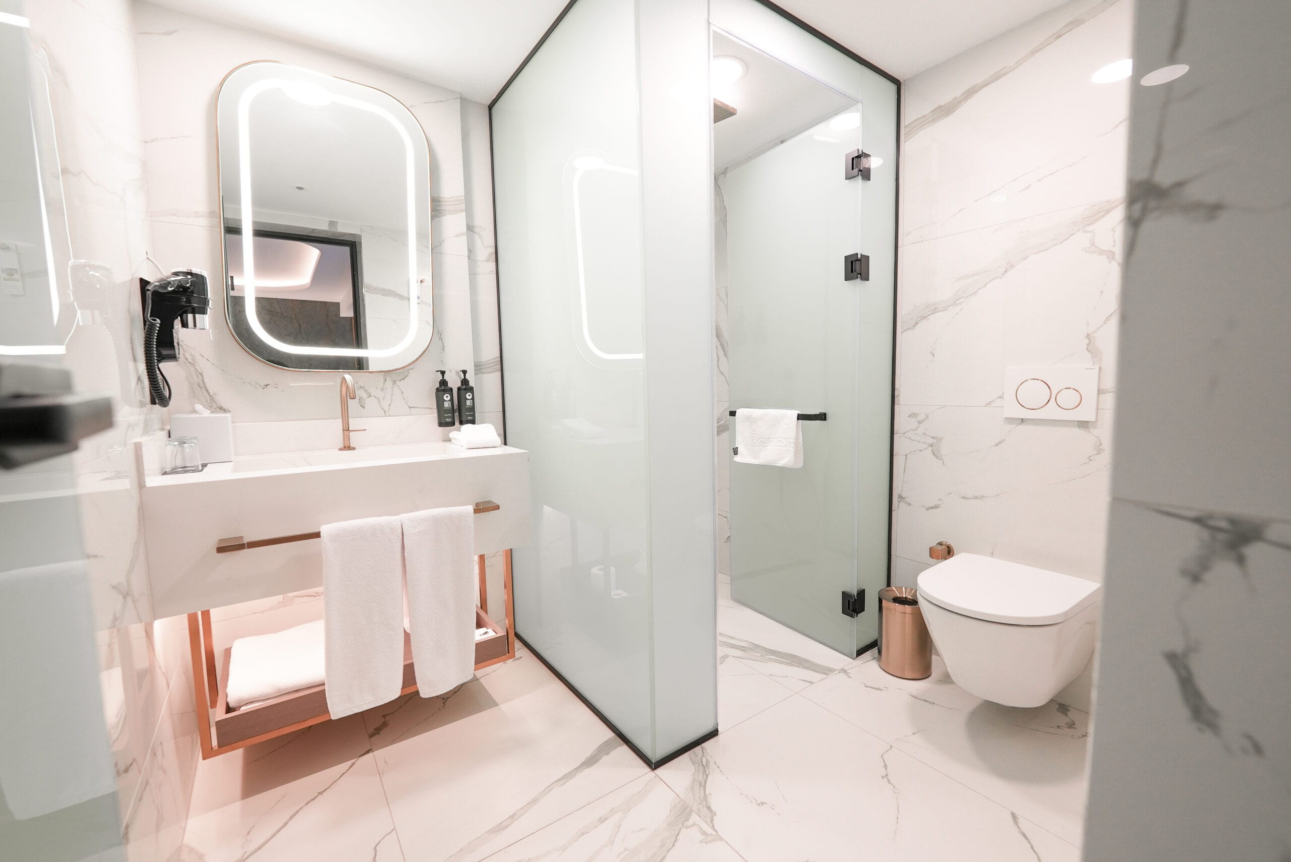 Ultra HD 50” TV, yüksek hızlı Wi-Fi ve dizüstü bilgisayar boyutunda kasa gibi teknolojik olanaklar, hem iş hem de tatil amaçlı konaklamalar için ideal. Oturma alanındaki konforlu koltuklar ve çay-kahve köşesi, günün yorgunluğunu atmak için birebir. Banyodaki modern detaylar, aydınlatma, ışıklı makyaj aynası, modern duş kabini ve üst düzey banyo malzemeleri ile kendinizi özel hissedeceksiniz.